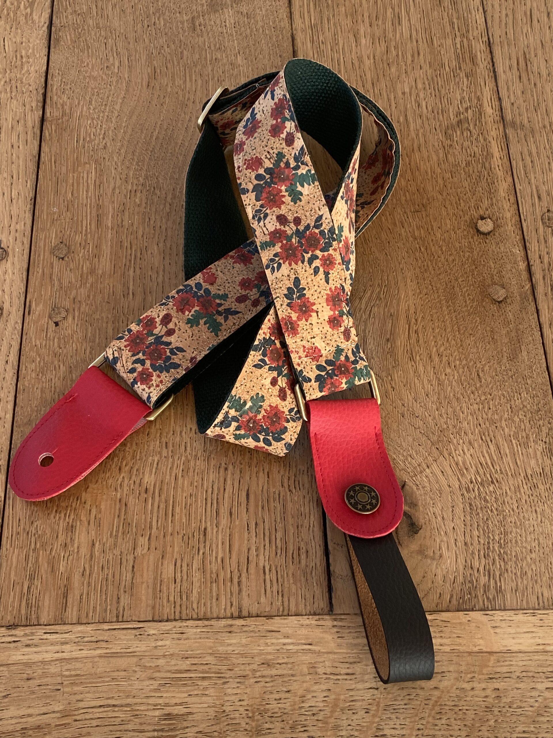 Toutes les sangles sont assemblées avec du tissu de liège imprimé de différents motifs ou skai cousu sur de la sangle coton/polyester ou simili cuir/suédine.